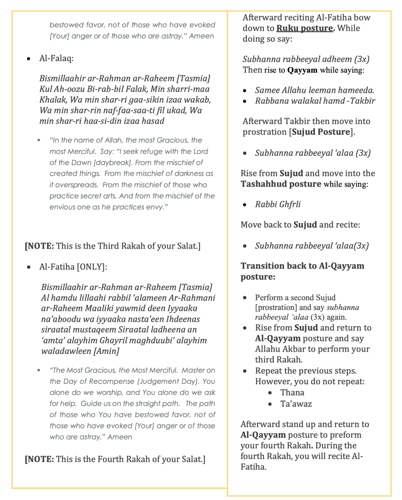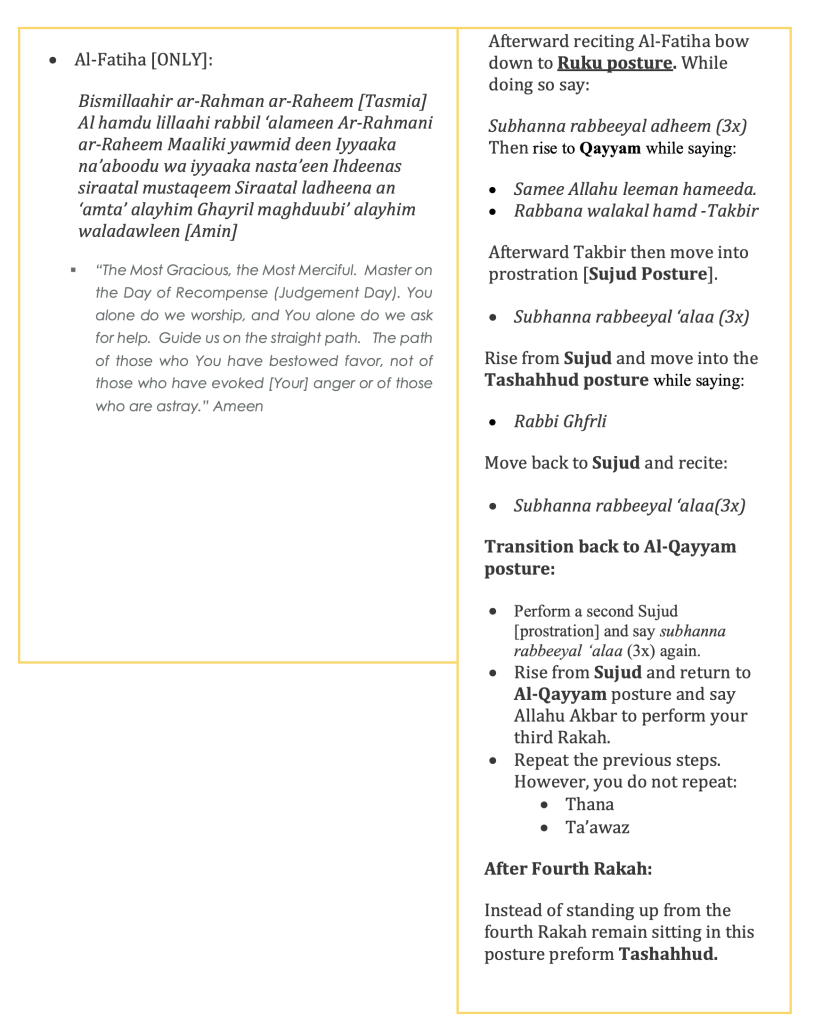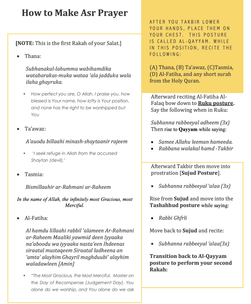 - Salat Al Asr (Afternoon Prayer); is an eight Rakat unit of prayer, comprising of four Rakat Sunnah (optional but recommended) and four Rakat Fard (obligatory – recited silently) prayer.